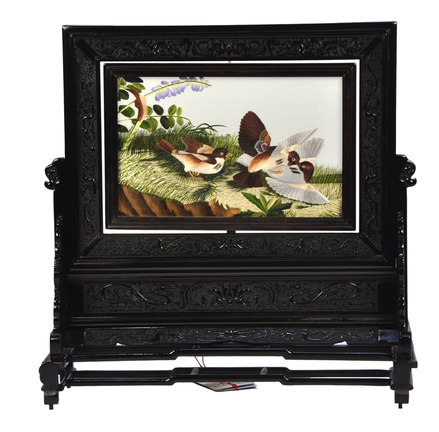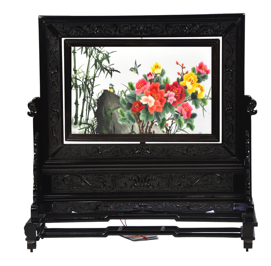 产品名称:紫檀苏州双面绣 (作品代码:SZ-7889) 产品规格:46X41CM(外框尺寸) 25X16CM(绣品尺寸) 产品工艺:苏州绣娘手工刺绣。绣品图案部分可360度旋转 产品材质:真丝面料+桑蚕丝线+玻璃+紫光檀木架 产品包装:锦盒礼品装 娇古出厂价:2800元/件 市场零售参考价:6000元左右 最小起订量:1件----厂家直销,可当天发货(可混配图案) 产品描述:紫光檀苏州双面绣为苏州绣娘手工刺绣而成,木框为目前中国苏州双面绣材质紫光檀,整体框架花纹雕刻细腻。图案有花卉(牡丹,梅花,荷花,兰花等),花鸟,动物(熊猫,老虎,鱼等),山水,风景,名家字画等。图案多达一百多种,有古色古香的,有现代气息的,高贵典雅,是赠送客人的特色礼品之一。 系列推荐